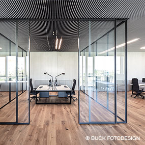 Durch die großen Fensteröffnungen hat man einen sehr schönen Blick in das innere des Gebäudes. Der Bauherr, die Textilmacher GmbH aus München, entschied sich bei der Beleuchtung für die schlanken Luxsystem LED Lichtlinien der Leuchtenserie SL 20.3. Das Zusammenspiel von natürlichem Licht und Kunstlicht spielte darüber hinaus für das Architekturbüro Tillich aus München eine große Rolle und konnte mit der silbernen Luxsystem Leuchte sehr gut realisiert werden.